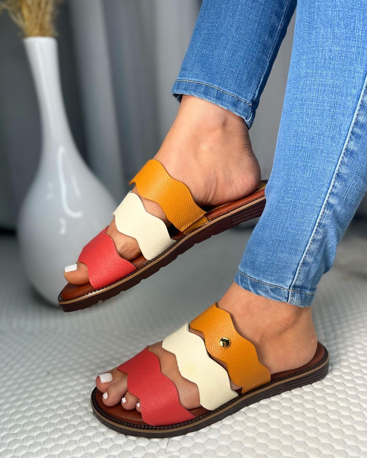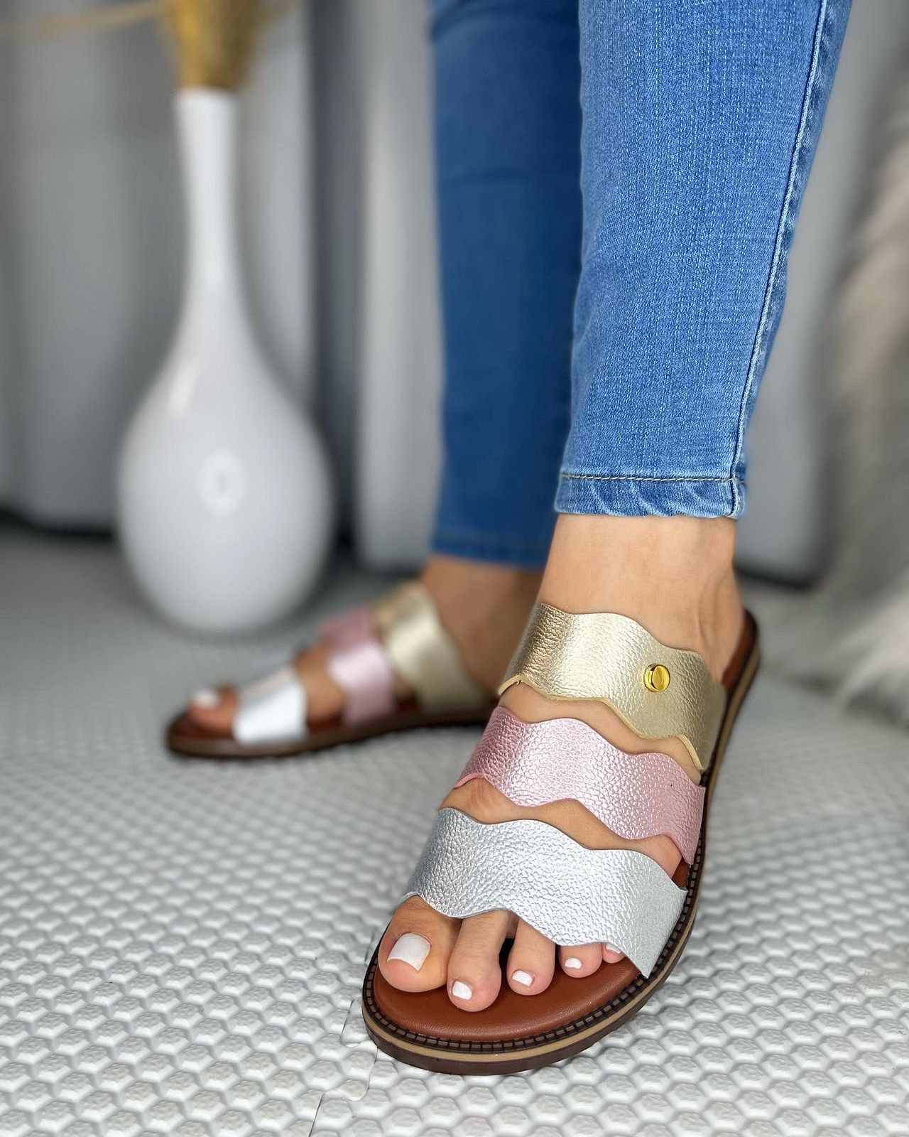 Introducing the epitome of timeless glamour: flat sandals featuring three metallic, multicolor straps elegantly crossing from side to side. With each step, experience a kaleidoscope of hues that exudes an aura of enchanting elegance. Crafted with meticulous attention to detail, these sandals redefine luxury with their captivating blend of metallic tones. Step into sophistication and make a lasting impression wherever you go. Experience the perfect fusion of style and comfort with our metallic, multicolor three-strap flat sandals today.