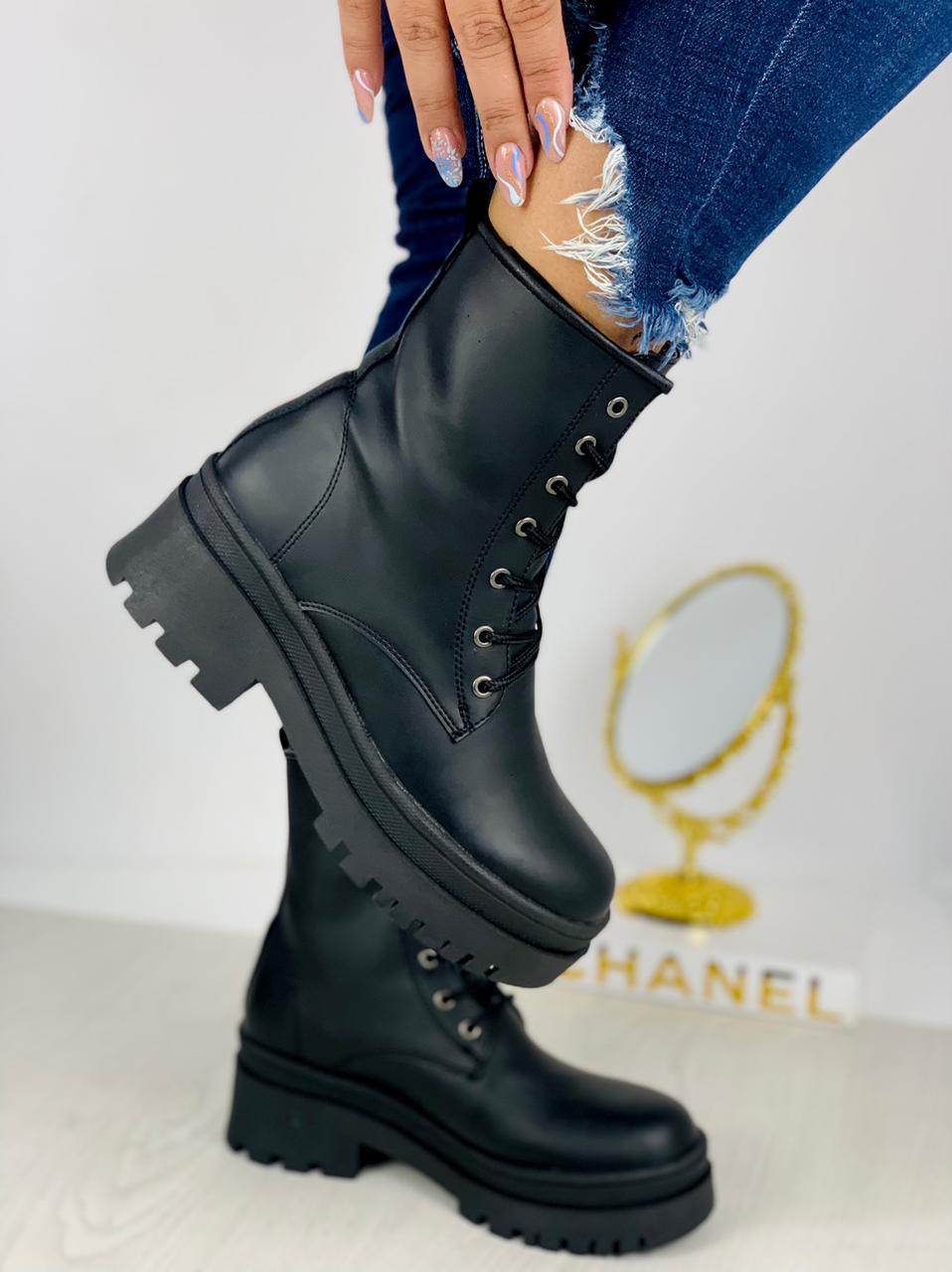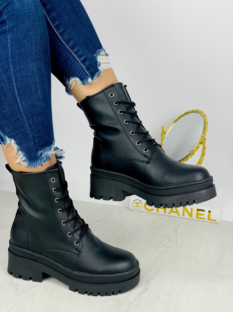 These black lace-up ankle boots have a sturdy chunky platform sole, offering a modern look and reliable comfort. Their minimalist design makes them versatile for any casual or chic outfit.