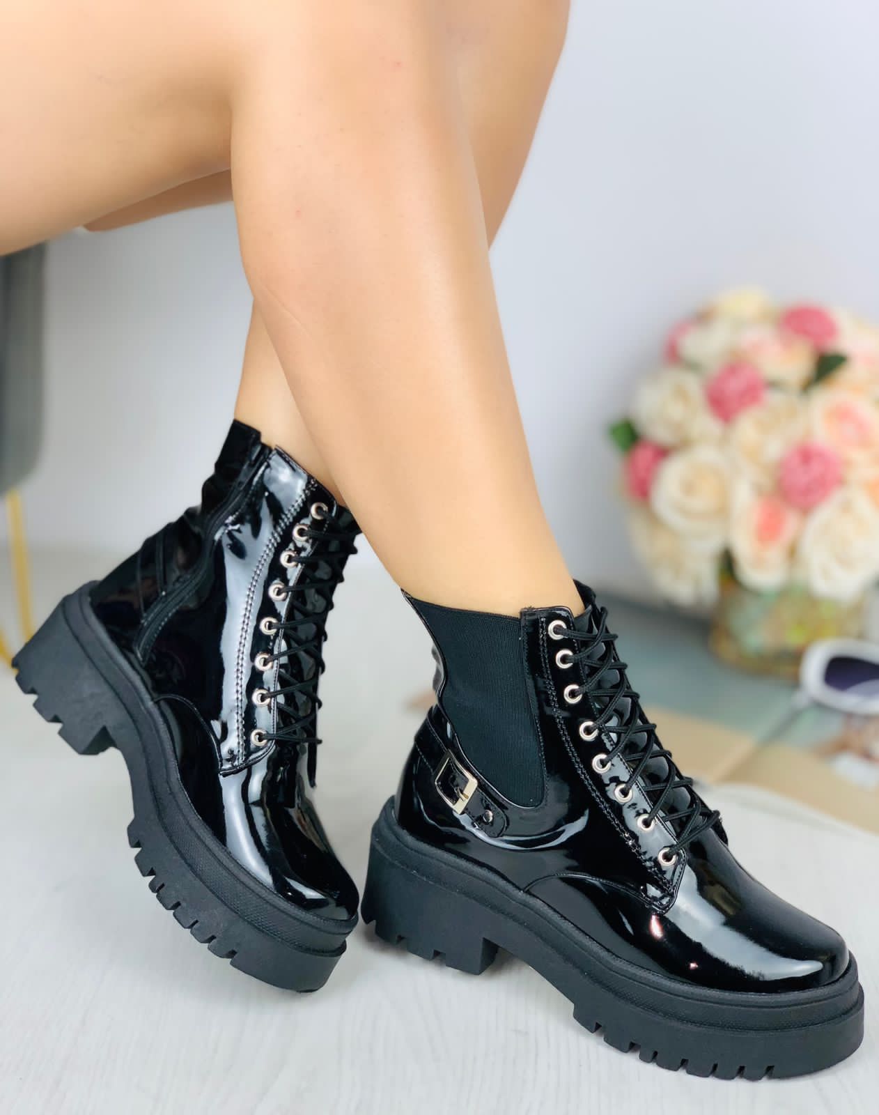 These black patent leather boots showcase a chunky sole and a stylish buckle detail on the ankle. The lace-up design provides a snug fit, while the shiny finish adds a sleek, modern vibe to any outfit.