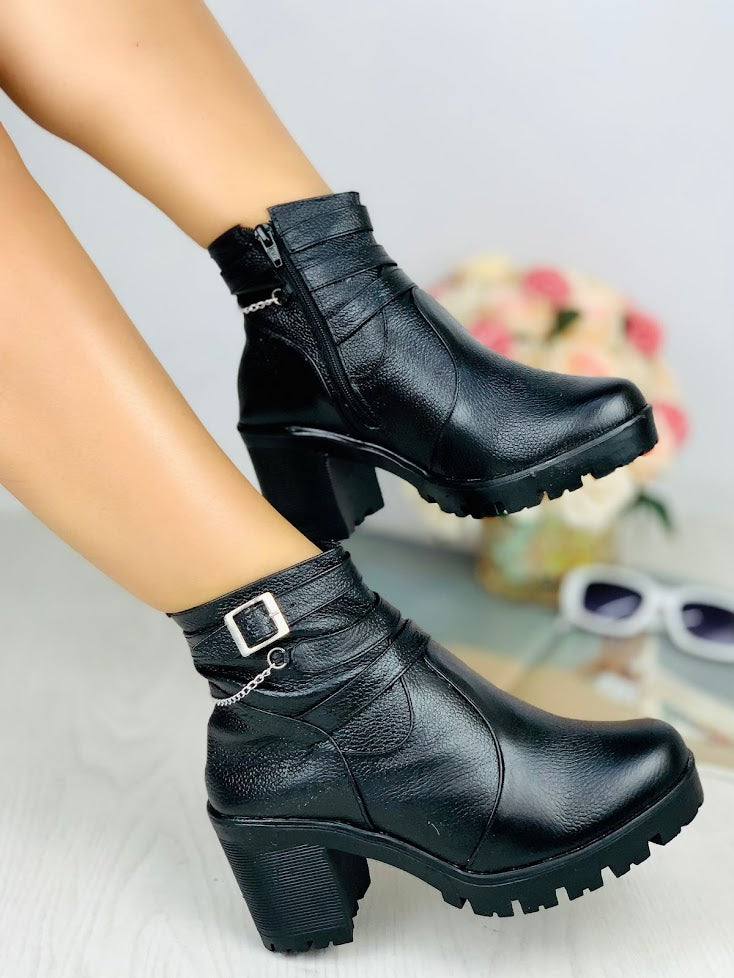 These black ankle boots feature a sturdy block heel and textured leather for a chic, edgy look. Designed with a stylish buckle and chain detail, they provide a mix of elegance and modernity. The zipper ensures easy wear, while the rugged sole offers comfort and stability, making them ideal for both casual and dressier occasions.