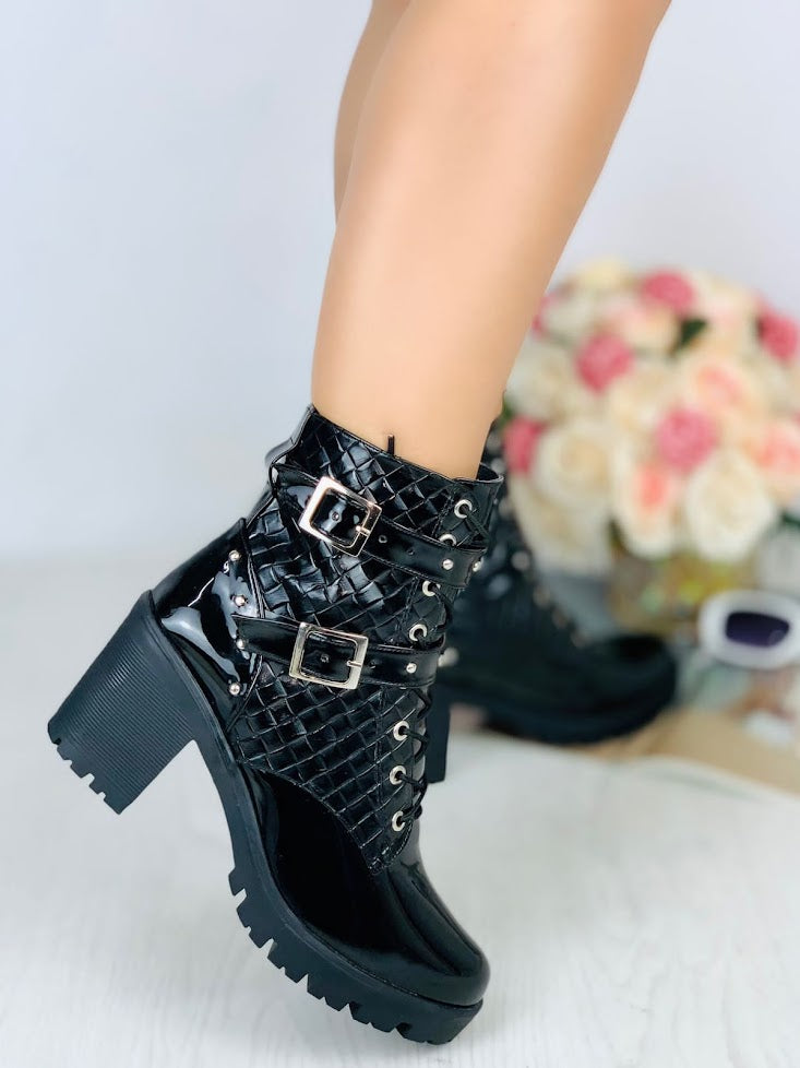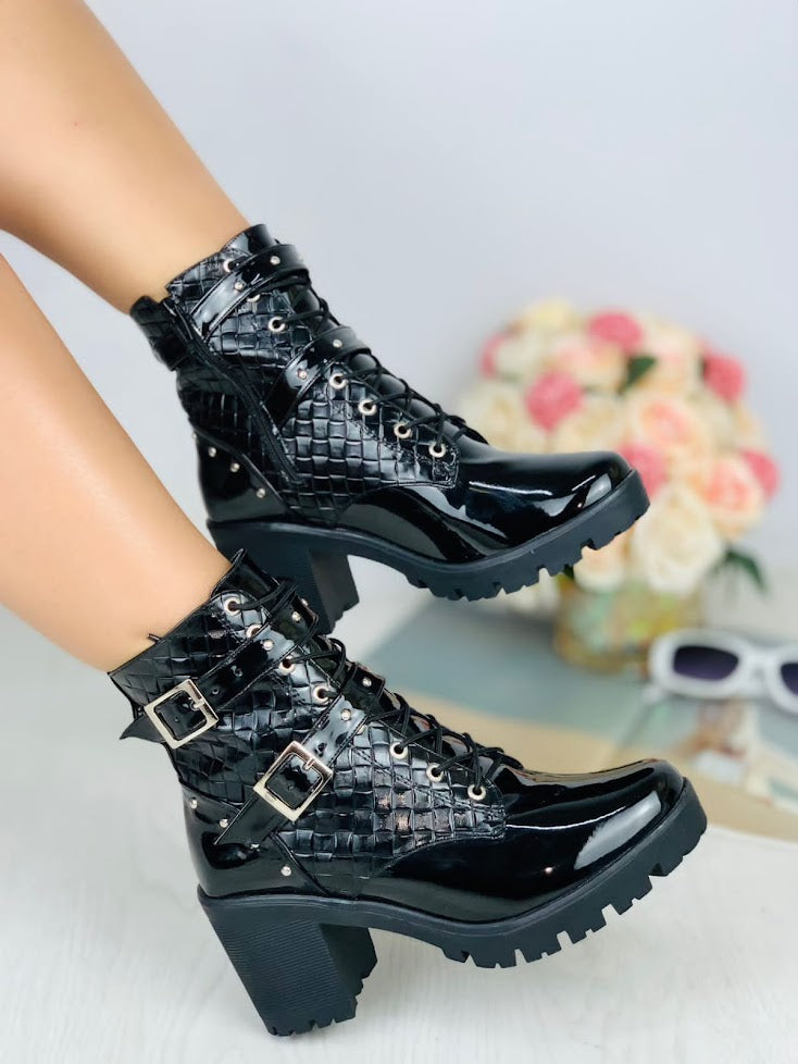 Regular price $300.00These black croc-embossed patent leather boots feature a bold lace-up design with dual buckle straps for added flair. The thick block heel and chunky sole provide stability and comfort, while the glossy, textured finish gives a high-fashion look. These boots are perfect for those looking to make a statement without sacrificing comfort and practicality.