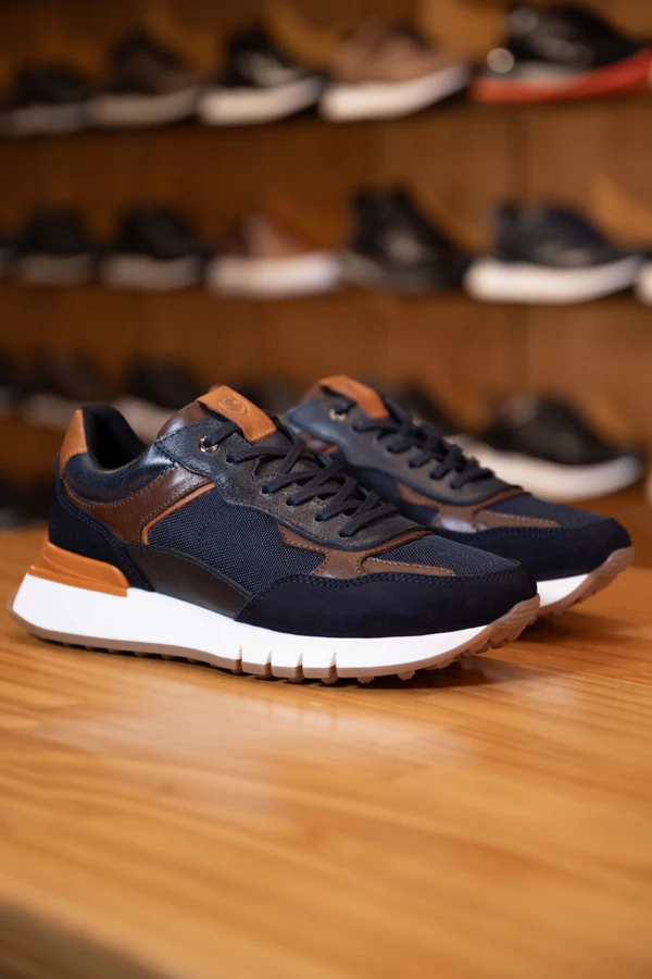 Designed for movement and modern life, these navy and tan leather sneakers combine sporty energy with urban refinement. Their cushioned sole offers support for all-day wear, while the color-blocked panels and mixed textures add standout appeal to any outfit.