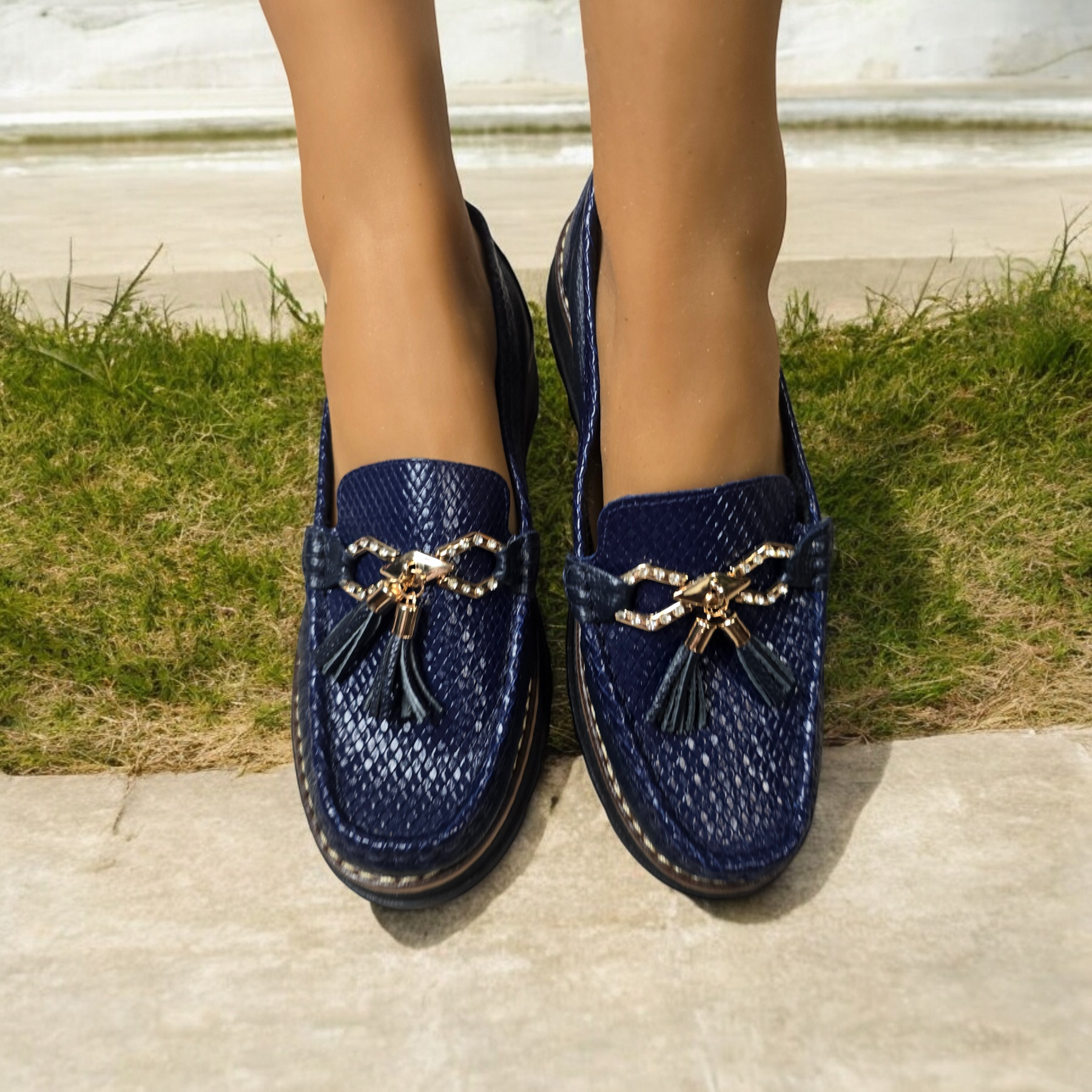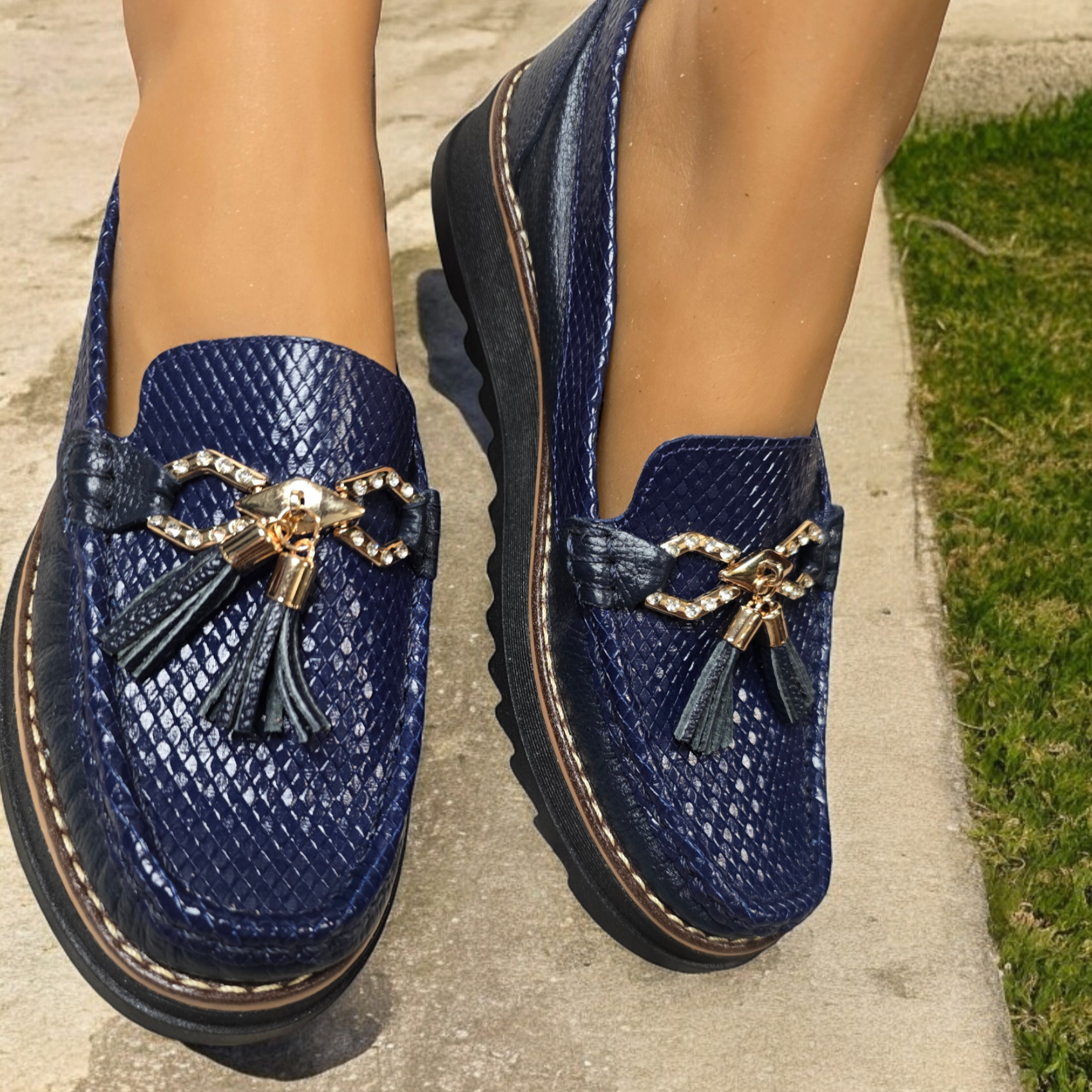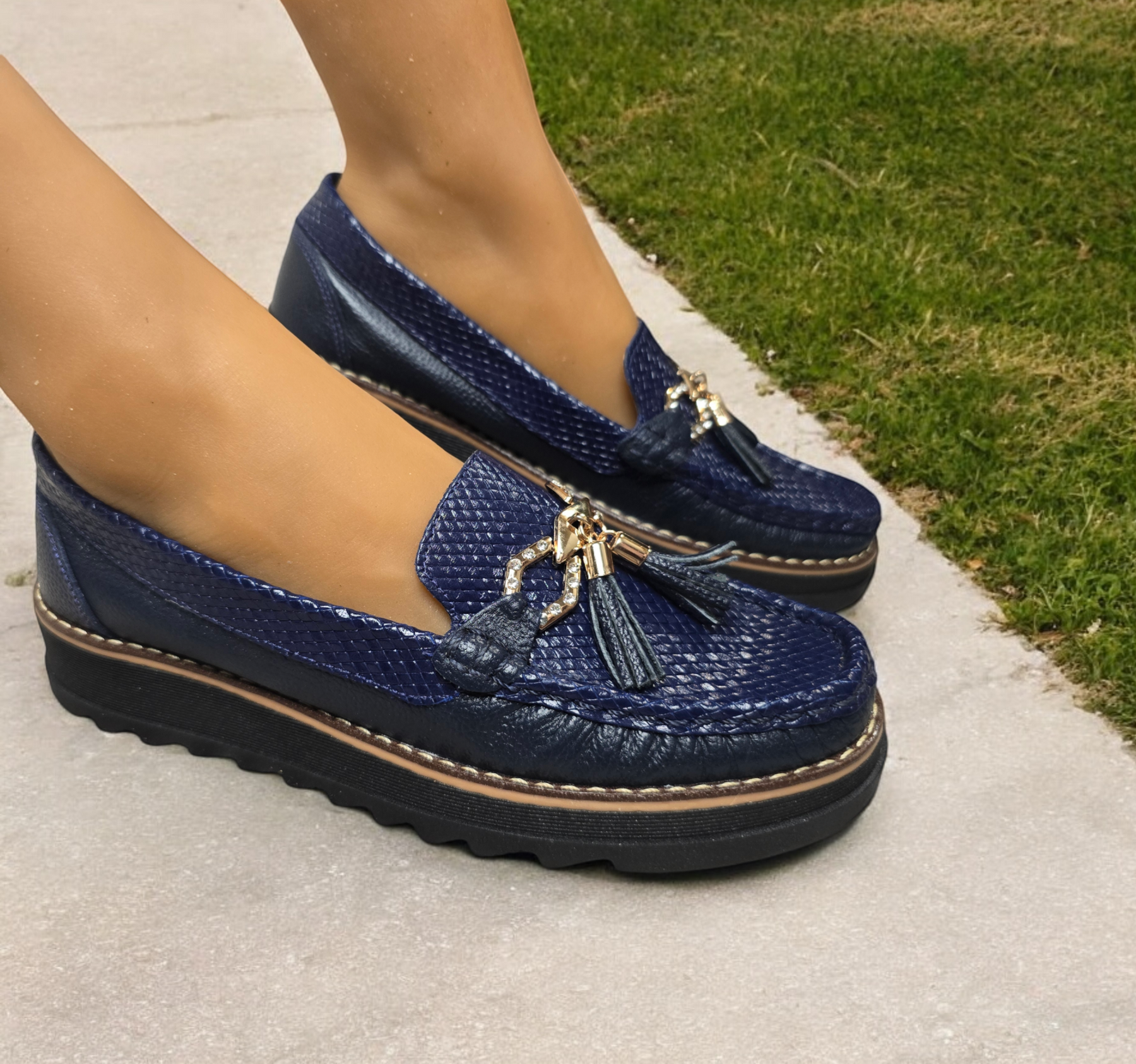Pair these navy loafers with a crisp white shirt and slim trousers for a sharp office look, or style them with a casual dress for a laid-back, chic weekend vibe. These loafers add a sophisticated touch to any outfit.