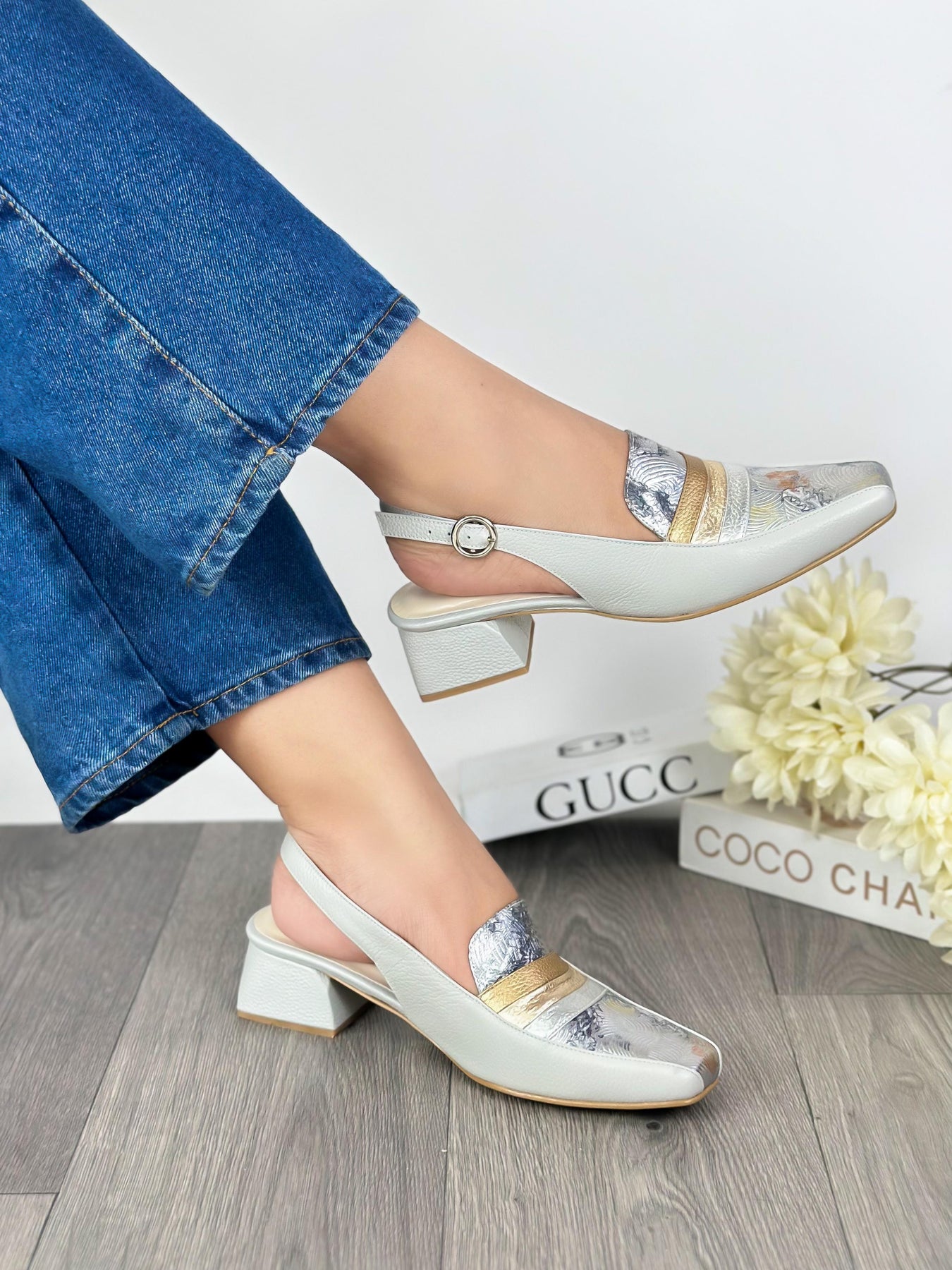 These slingback block heels exude elegance with their metallic silver and gold accents. Designed with a floral-embossed toe and a comfortable low block heel, they blend sophistication and wearability. The adjustable strap ensures a secure fit, while the soft leather construction adds a touch of luxury. Perfect for both formal occasions and stylish daywear, these heels are a refined choice for any wardrobe.