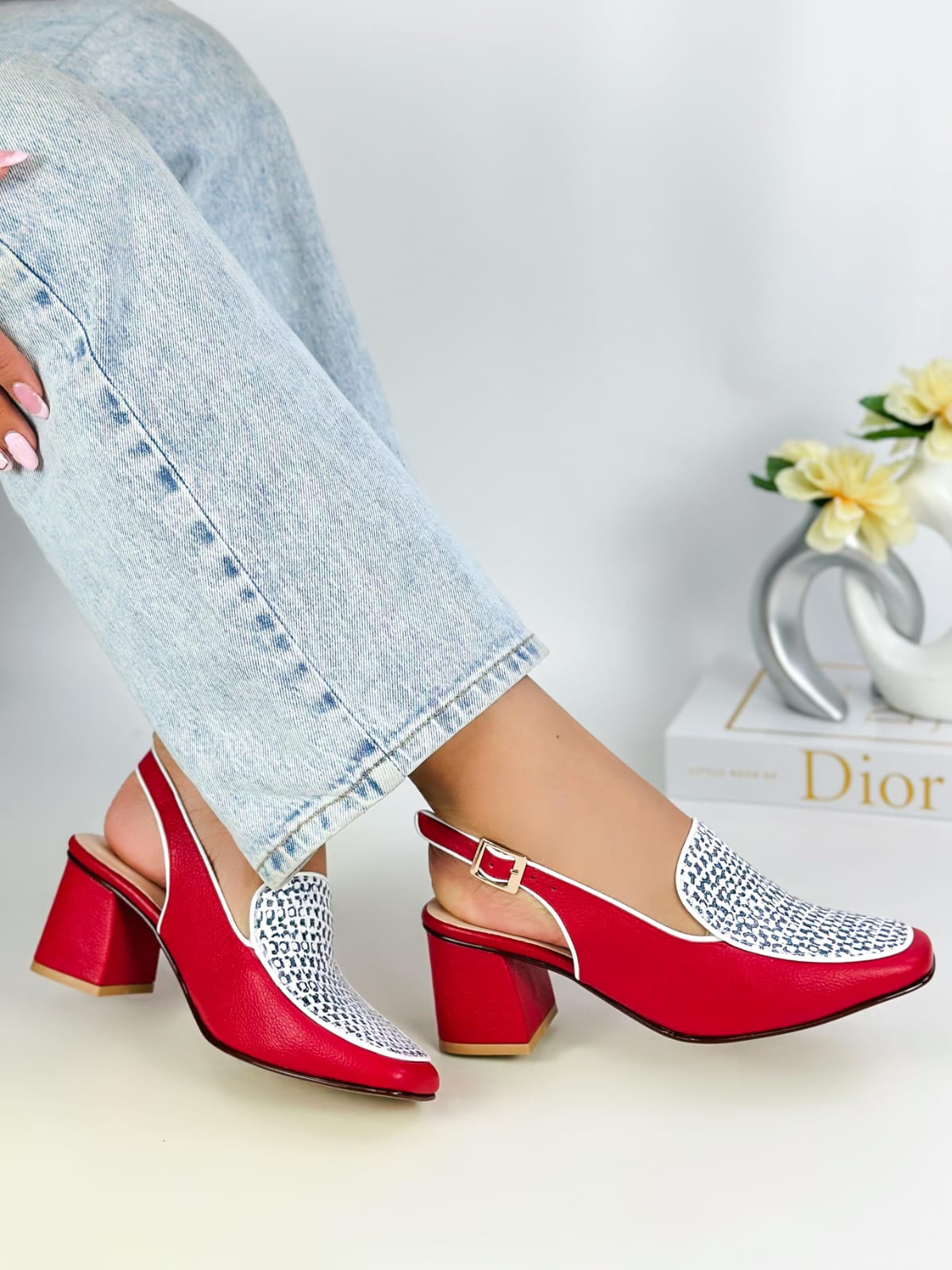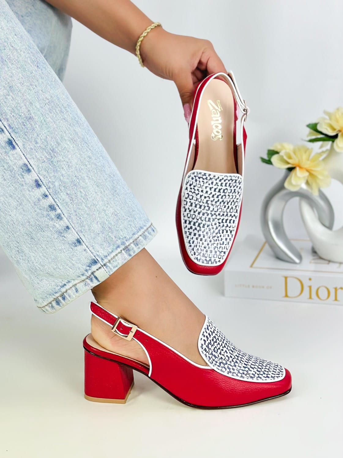 These red block heel slingback loafers feature a unique blend of a vibrant red base with a textured white and black front panel. The adjustable slingback strap ensures a snug fit, while the sturdy block heel provides a comfortable lift for all-day wear. Ideal for those who love to stand out, these shoes combine bold color with classic design elements.