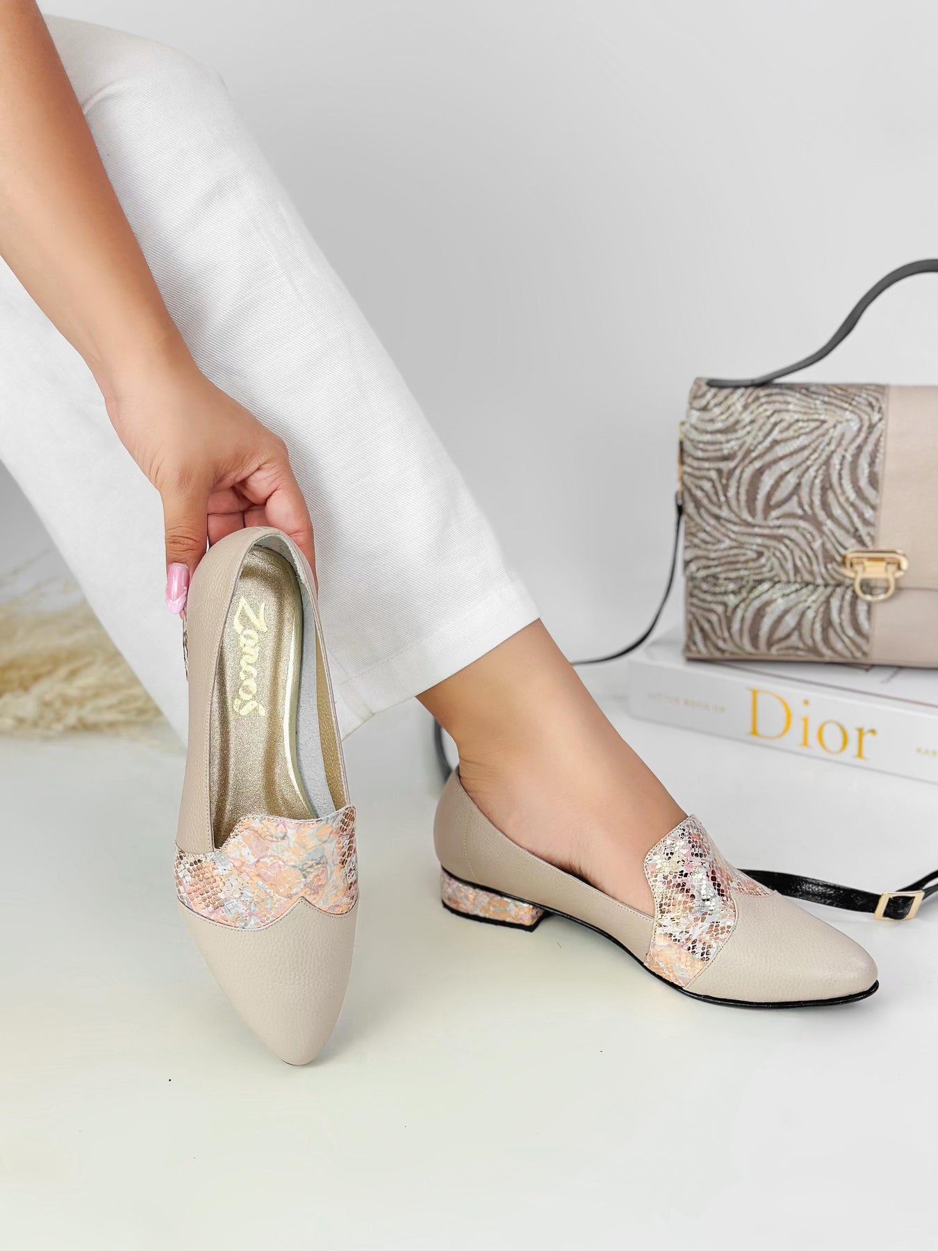 Regular price $210.00Description: These beige loafers feature a refined snake-textured accent on both the vamp and heel, combining subtle elegance with a trendy touch. The low block heel ensures comfort while maintaining a stylish profile, making these shoes perfect for daily wear. Their neutral tone makes them versatile, ideal for pairing with a wide range of outfits, whether for a casual day out or a polished office look.