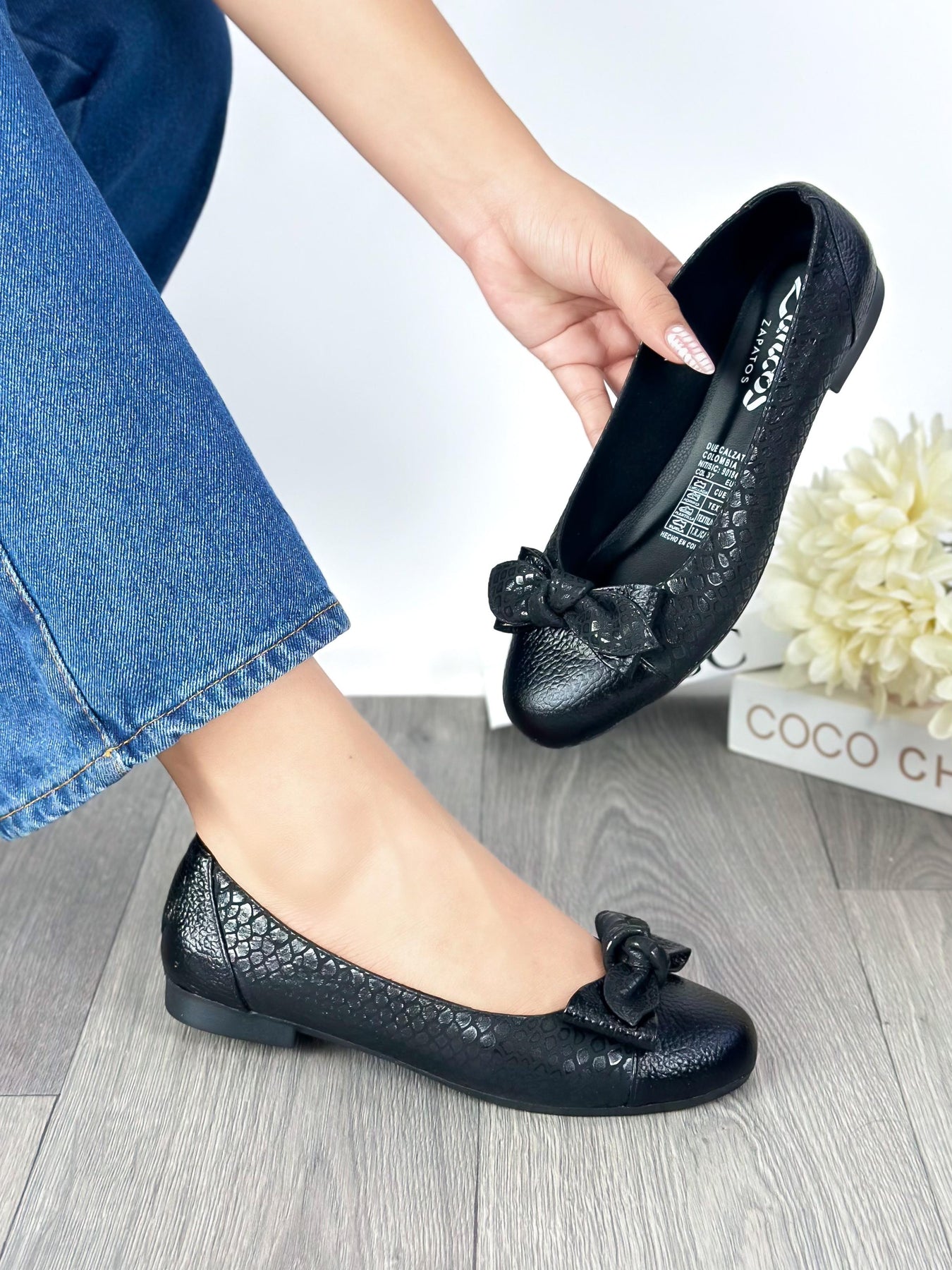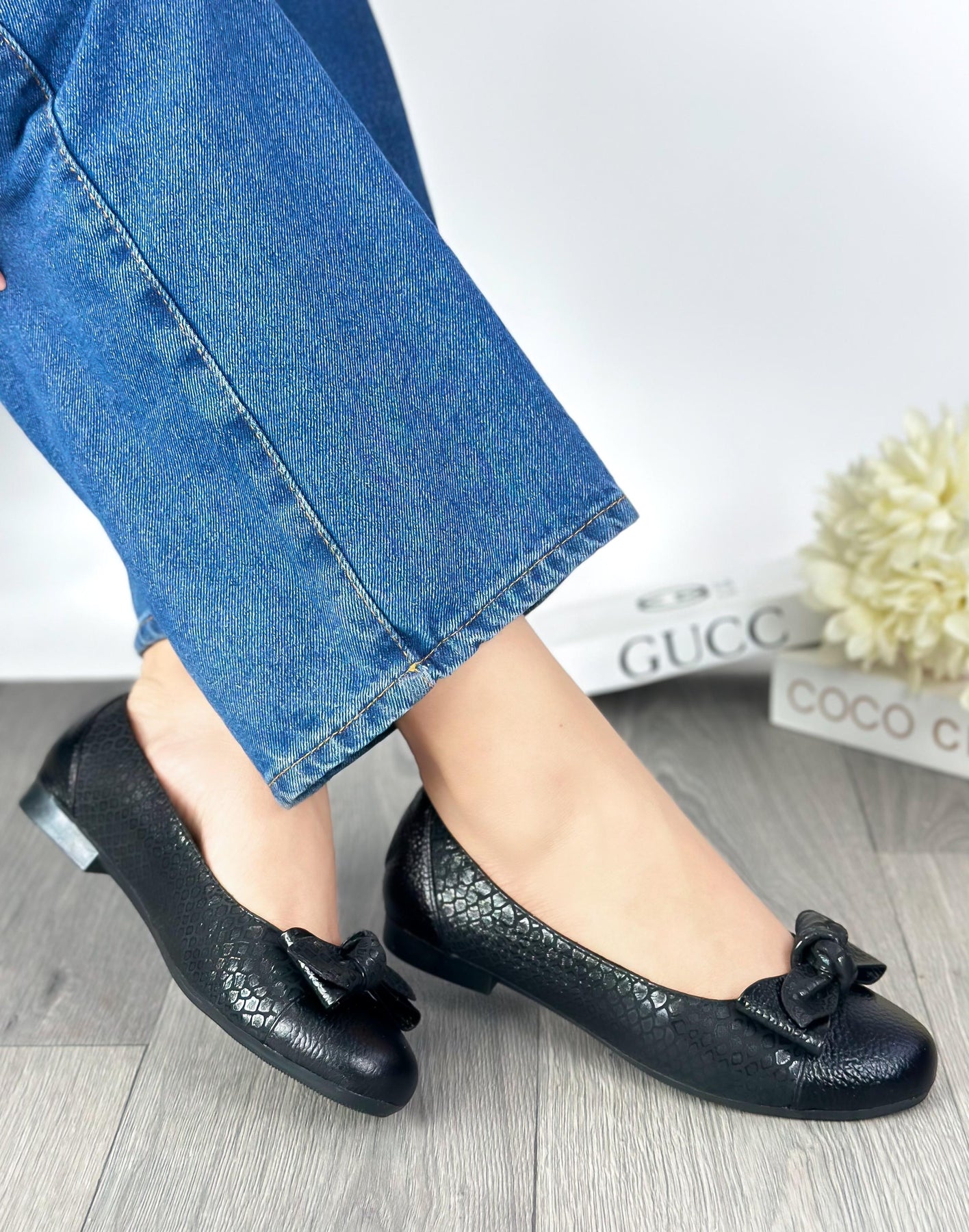 These black textured ballet flats combine timeless elegance with everyday practicality. The sleek crocodile-inspired pattern adds depth, while the dainty bow detail enhances their feminine charm. Lightweight and comfortable, these flats are crafted for women who value style without compromising on comfort. Whether paired with tailored pants or casual dresses, they’re a versatile choice for any occasion.