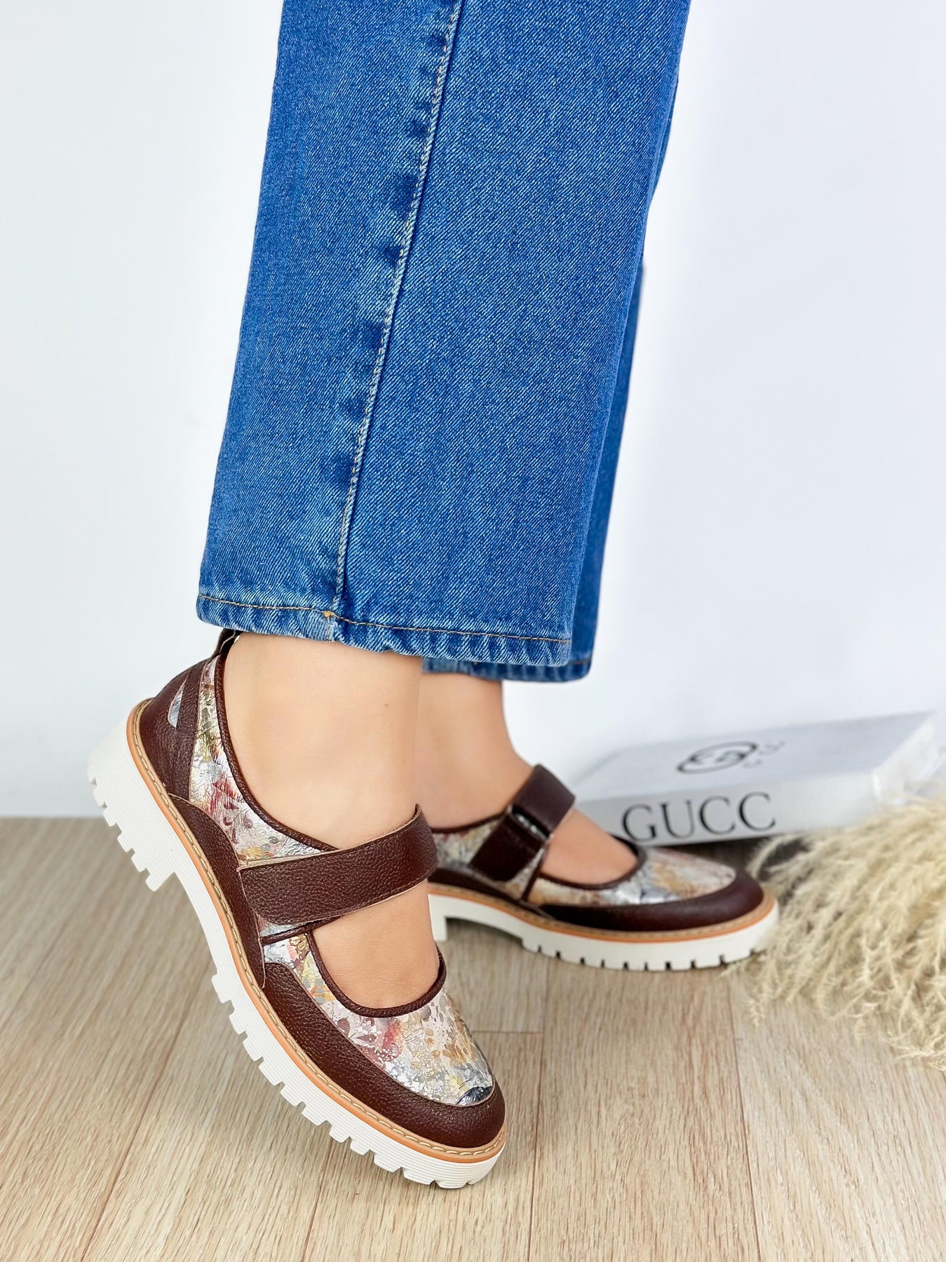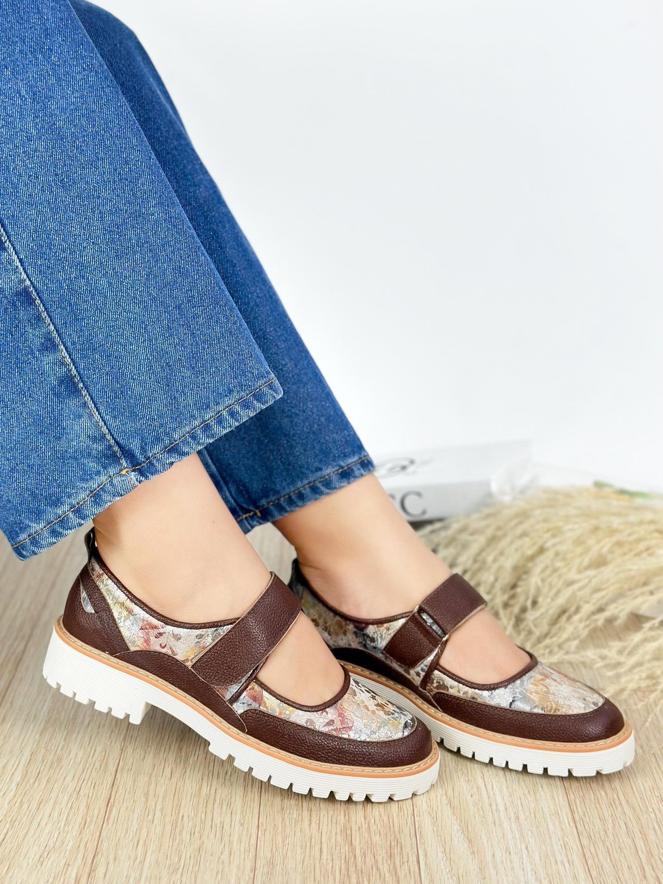 These brown Mary Jane flats feature a beautiful floral print and a sturdy design that combines comfort with elegance. The textured leather and floral mesh upper create a unique contrast, while the chunky white sole provides stability and all-day wearability. Perfect for casual outings, these flats deliver a stylish edge to any look.