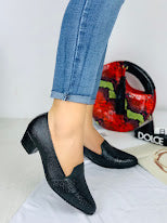 Step into sophistication with the Elegant Black Faux Leather Slip-On Pumps from Deminis Atelier. These pumps are designed for the modern woman who values both style and comfort. Featuring a classy pattern patch on the upper front, these shoes add a touch of elegance to any outfit. The shiny and sharp rough skin leather finish ensures a sleek and contemporary look. Perfect for both professional and casual settings, these slip-on pumps offer convenience without compromising on style. Elevate your footwear collection with these versatile and chic pumps.