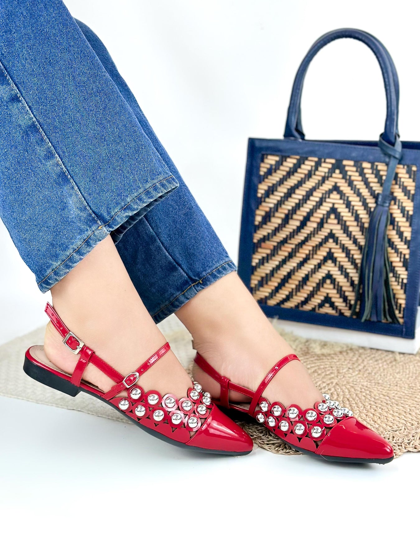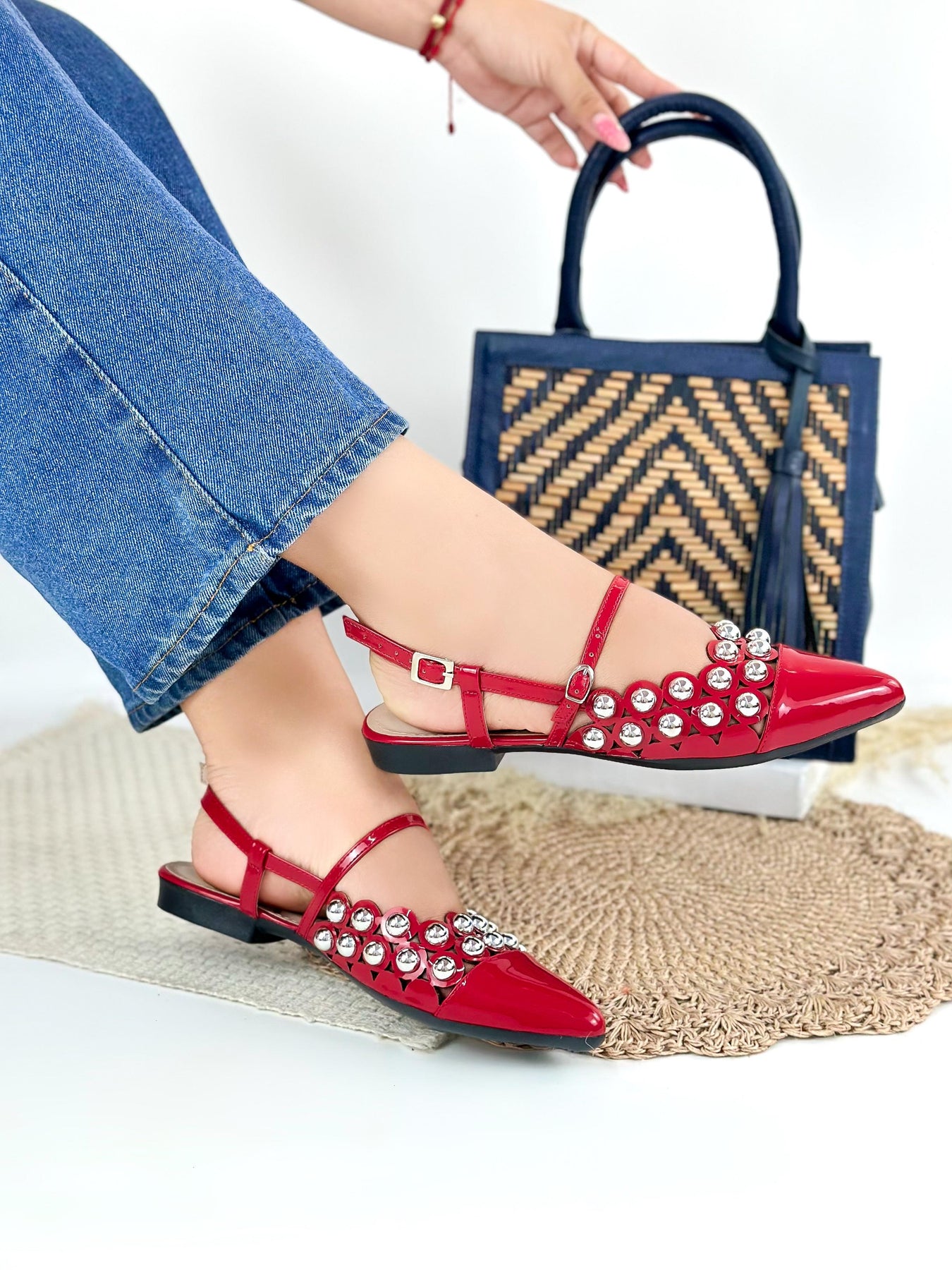 Turn heads with these bold and brilliant flats, designed to make every step a statement. Available in fiery red or cosmic silver, these pointed slingback shoes are adorned with oversized chrome studs for a dazzling edge. Crafted for comfort and confidence, they feature a low heel and adjustable strap for a secure fit that works for both day and night wear.