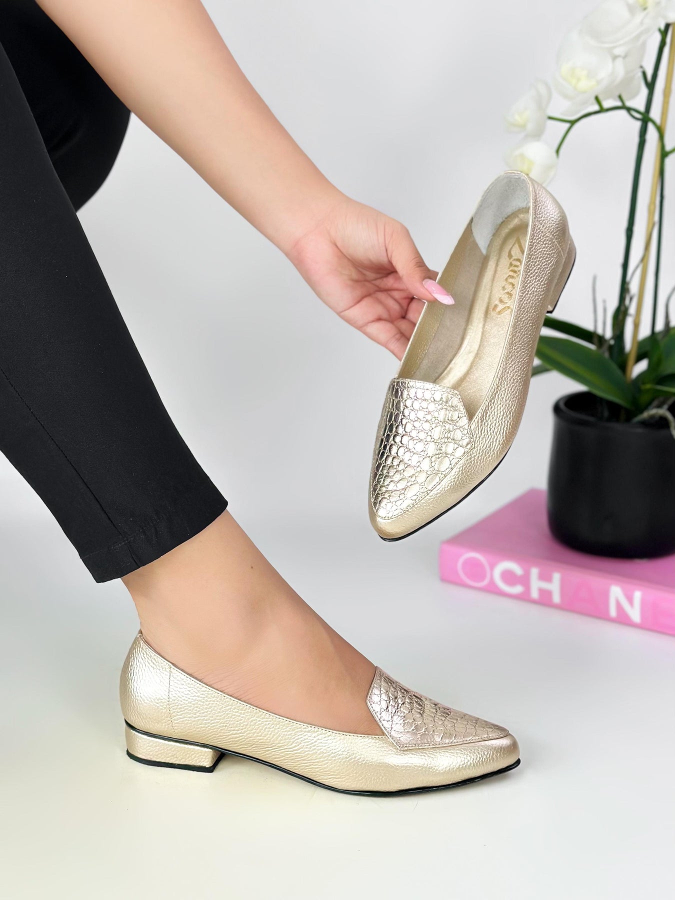 Description: These gold loafers feature a textured snakeskin accent on the vamp, offering a touch of elegance to a classic design. The low block heel provides stability and comfort for all-day wear, while the metallic finish adds a luxurious shine. Ideal for both professional and casual settings, these loafers are versatile and stylish, making them an essential addition to any wardrobe.