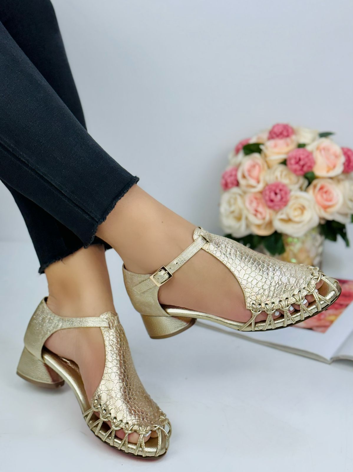 These shoes stand out with their combination of woven details, metallic texture, and comfort-focused design. The unique open-toe style and supportive block heel make them a memorable and versatile choice for customers looking for both fashion and functionality.