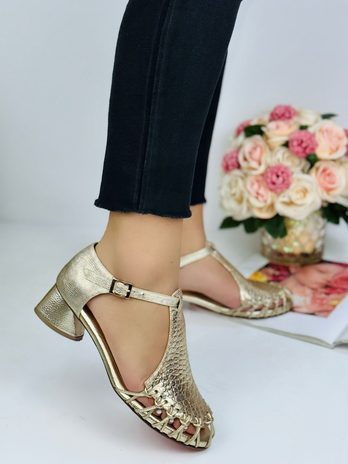 These gold block heels feature a unique woven open-toe design and textured metallic finish, combining style and comfort. The mid-height block heel provides support for all-day wear, while the adjustable ankle strap ensures a secure fit. Perfect for both casual outings and special occasions, these shoes offer a chic yet practical option.