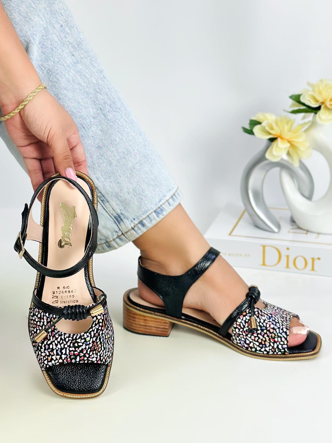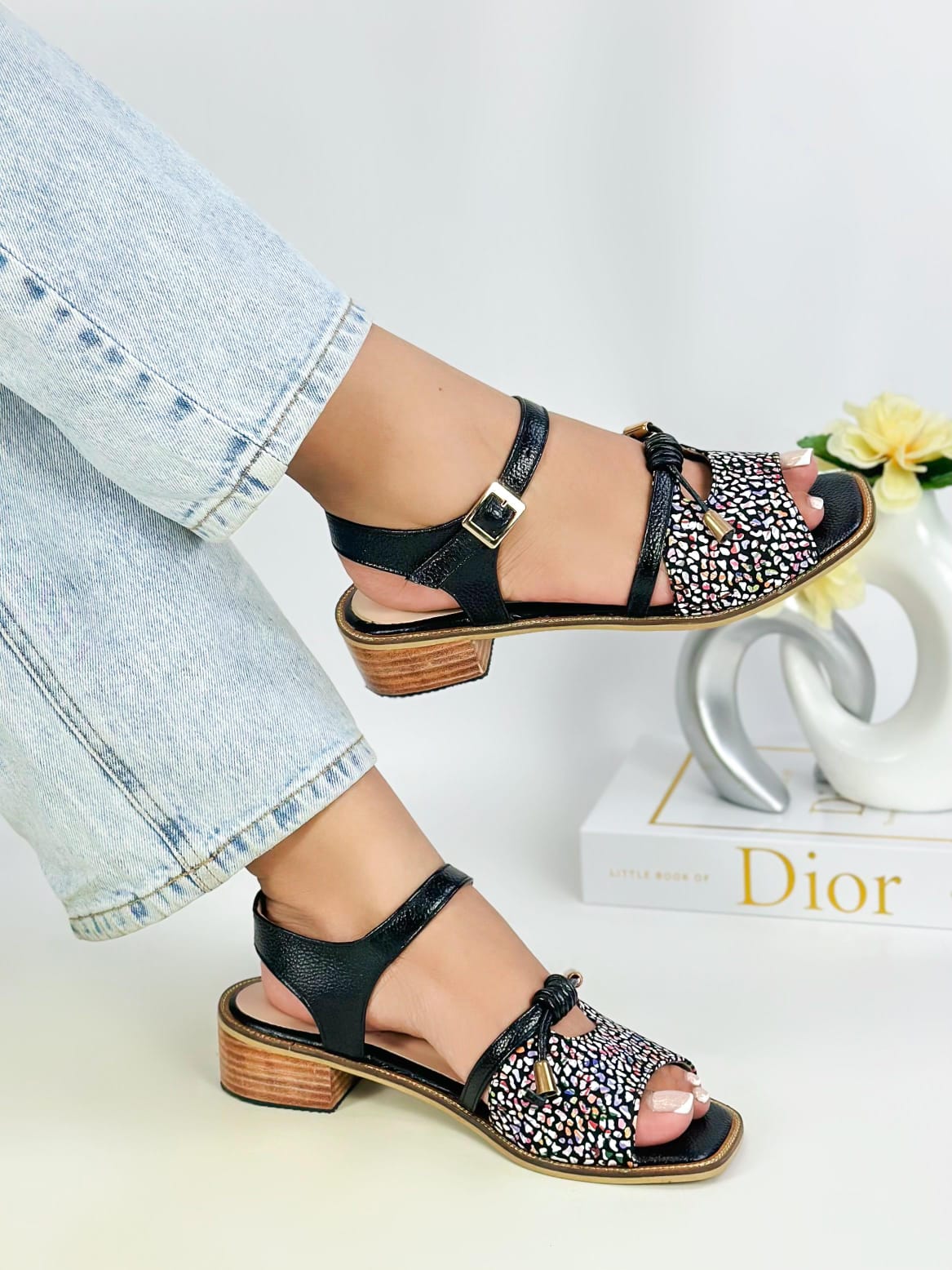 These striking sandals feature a vibrant multicolor leather design, accentuated by a playful knot detail at the front. The adjustable ankle strap and low wooden block heel add comfort, while the open-toe style ensures breathability during warmer days. Perfect for adding a pop of personality to any outfit, these sandals combine artisanal craftsmanship with contemporary fashion.