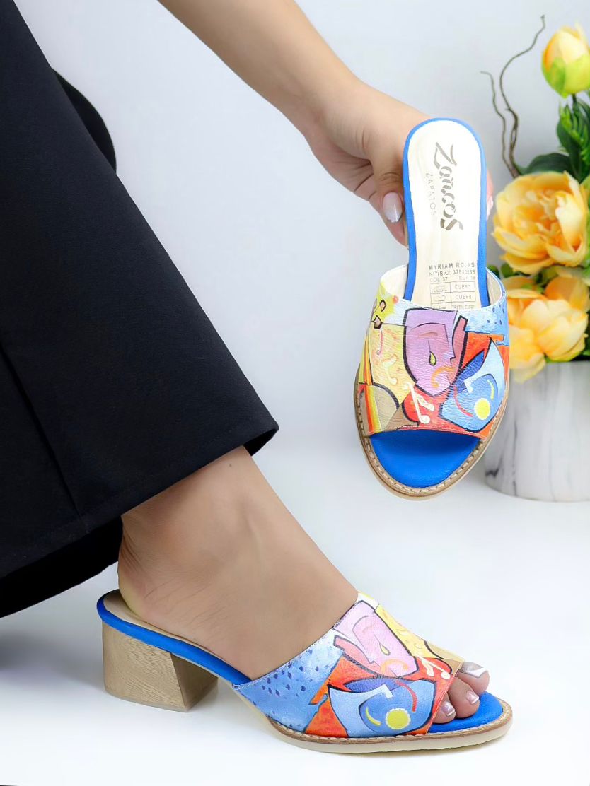 The image showcases a pair of sandals with a colorful and artistic design on the top part. The sandals feature a block heel, adding a touch of sophistication and elegance. They are paired with black trousers that end above the ankle, further accentuating the vibrant colors of the sandals. The plain white background provides a stark contrast, making the sandals the standout element in the image. This footwear design is a perfect blend of comfort and style, ideal for summer fashion trends.