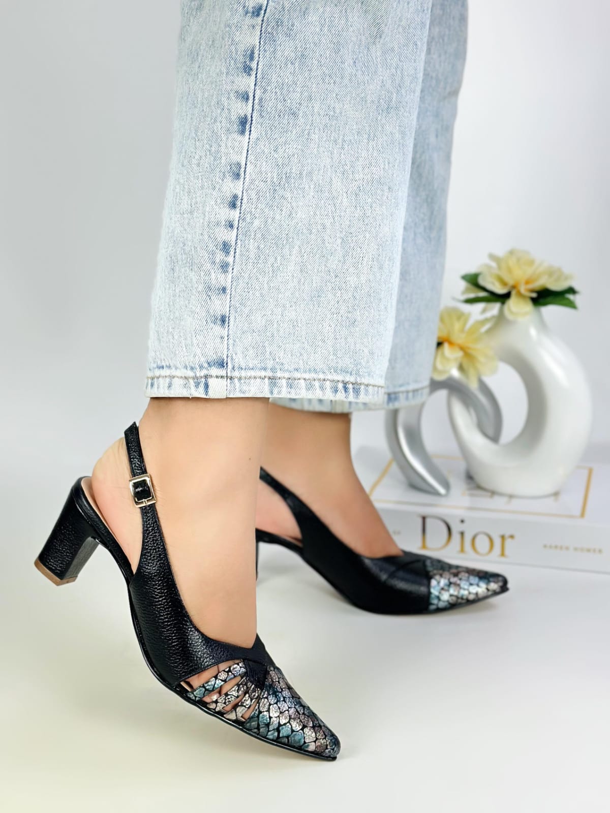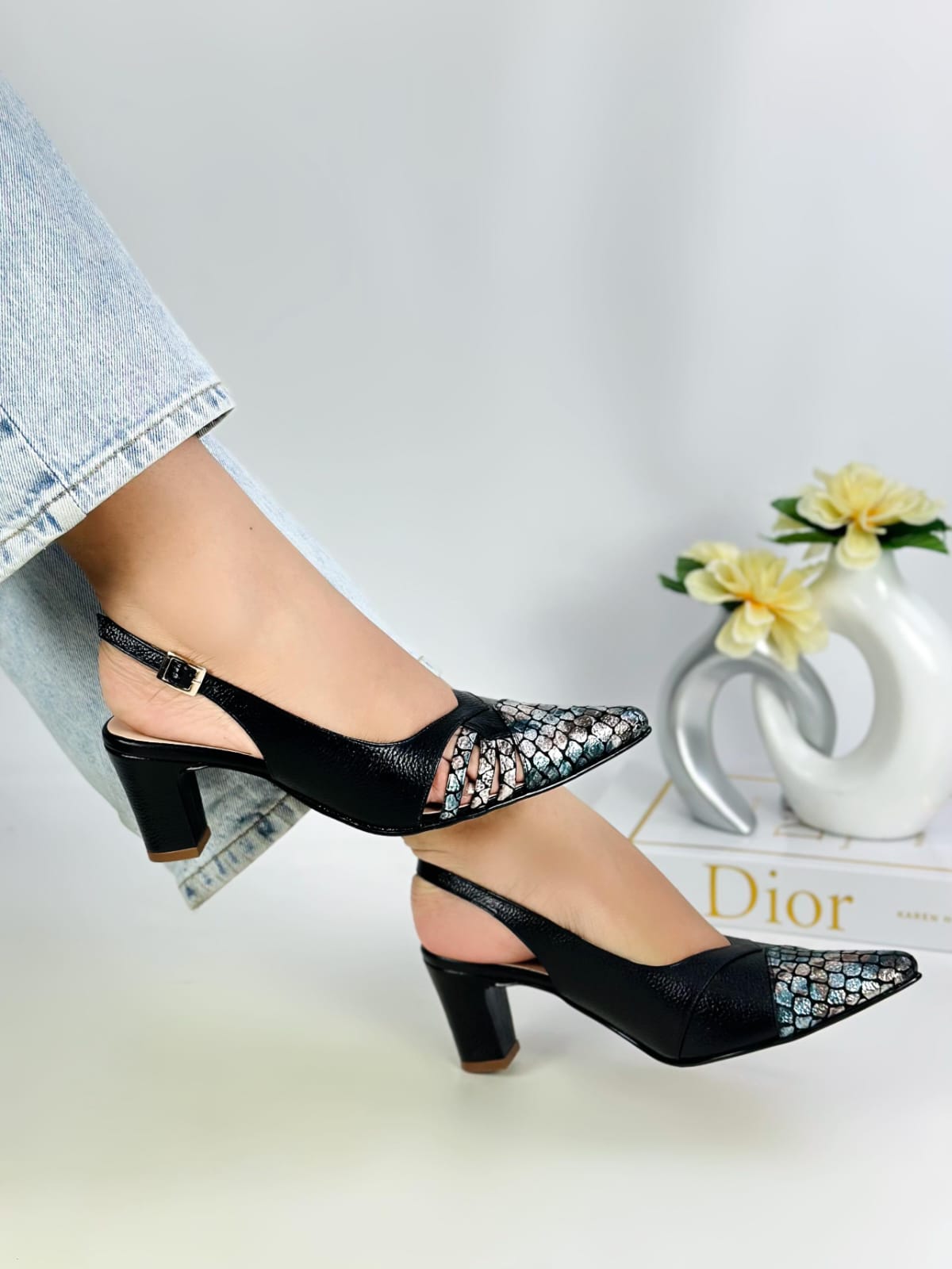 The block heel ensures comfort while walking, offering the perfect balance between style and practicality. These heels are ideal for women who want to make a statement without sacrificing comfort, and the combination of textures elevates the look to a truly unique level.