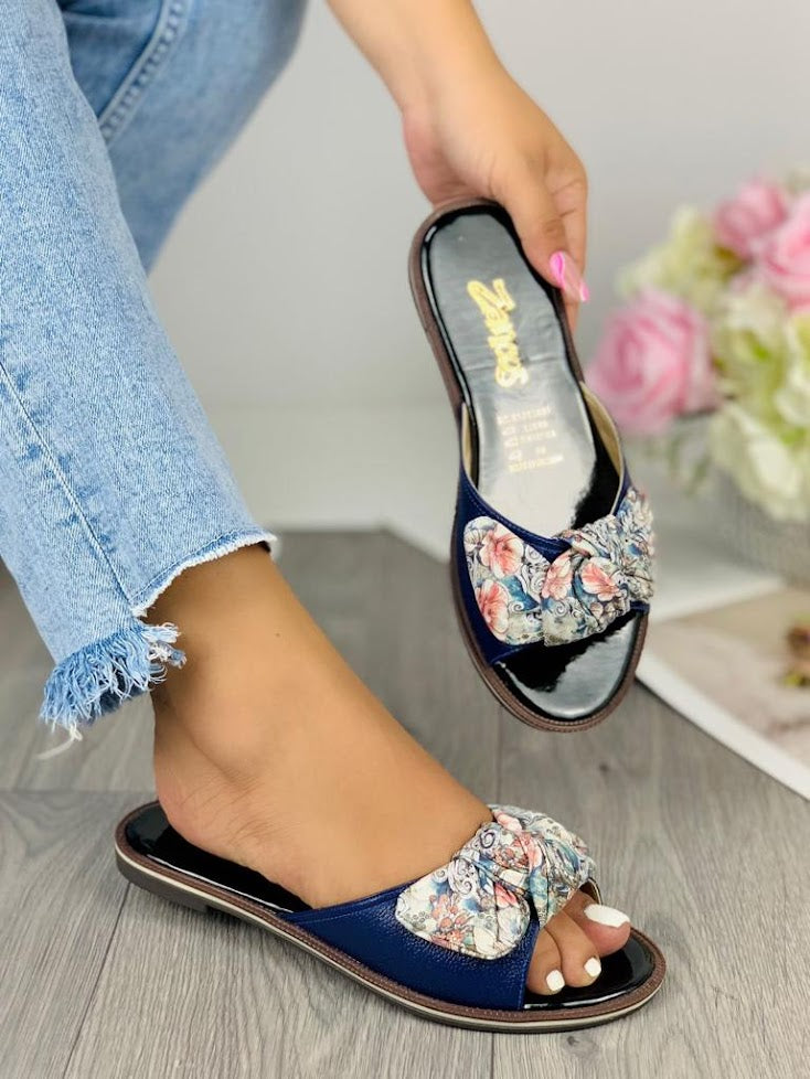 Deminis Atelier - Black Sandals with Blue Bow Tie Flower and soft leather straps for ultimate comfort