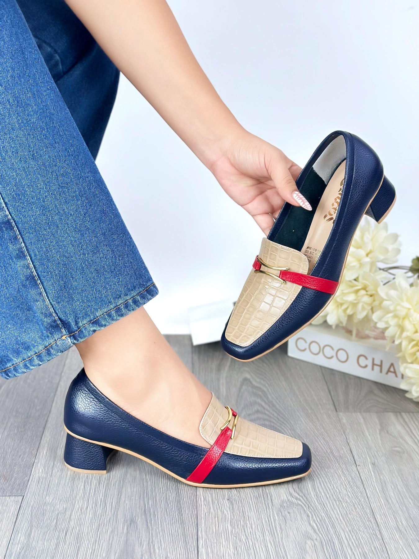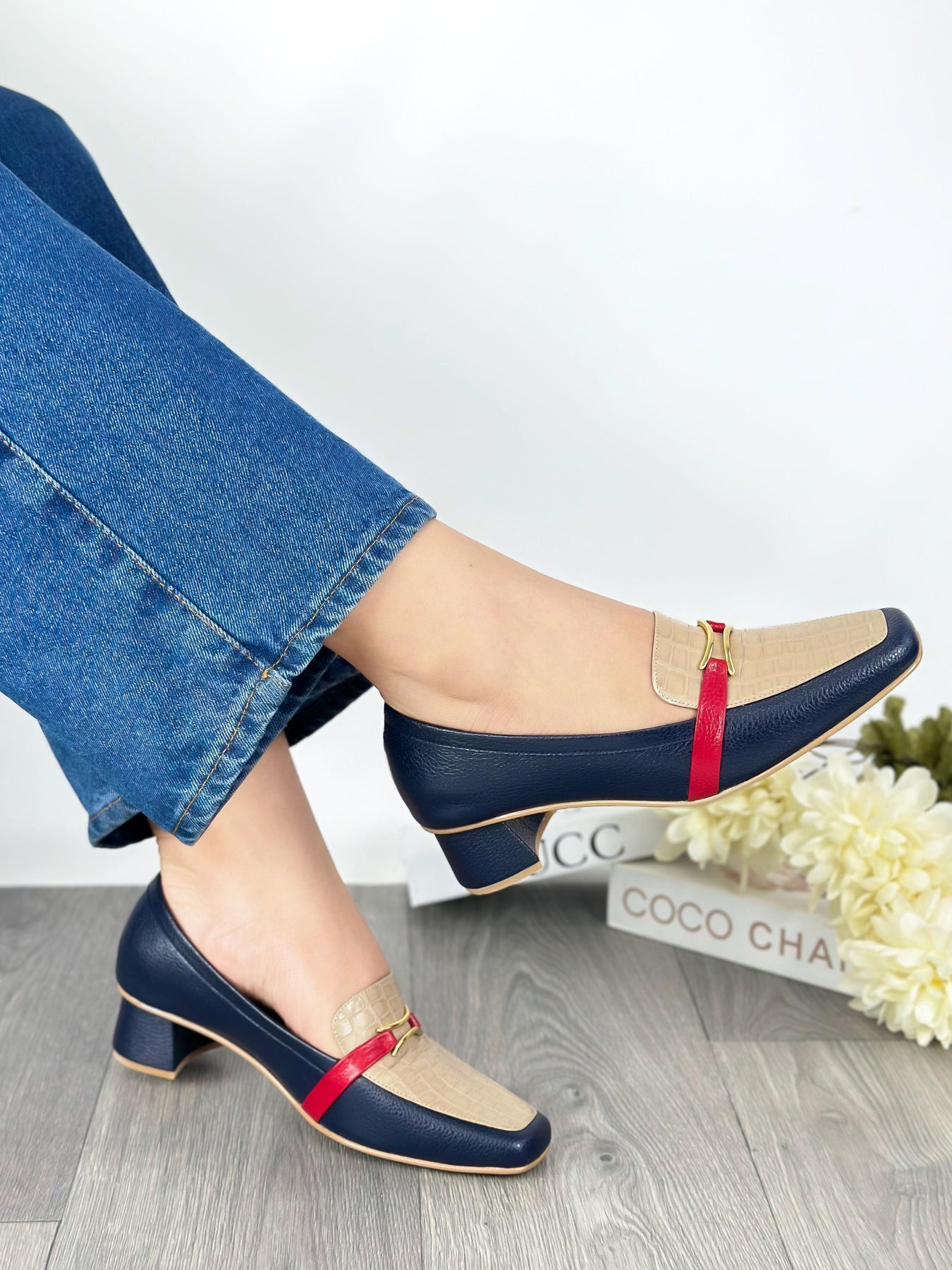 These loafers redefine sophistication with a navy leather base, a beige croc-embossed toe, and a bold red accent strap. The gold-tone buckle detail adds a touch of elegance, while the low block heel ensures all-day comfort. Perfect for work, brunch, or casual evenings, these loafers effortlessly combine functionality and style, making them a versatile staple in your wardrobe.