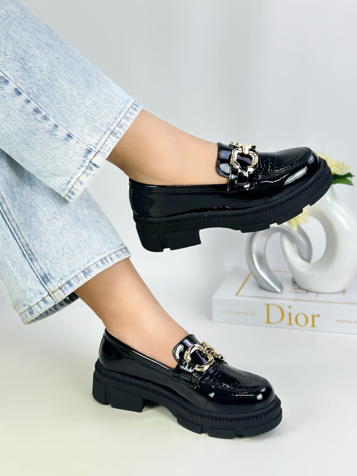 These sleek patent leather loafers feature a bold chunky chain detail, perfect for adding a touch of modern elegance to any outfit. The croc-embossed texture enhances their luxurious appeal, while the chunky rubber sole provides excellent support and durability. Designed for both style and comfort, these loafers are a versatile addition to your wardrobe, ideal for work, weekends, or casual outings.